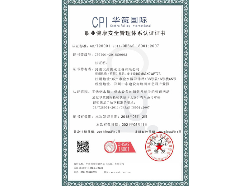 職業(yè)健康安全管理體系認(rèn)證證書(shū)